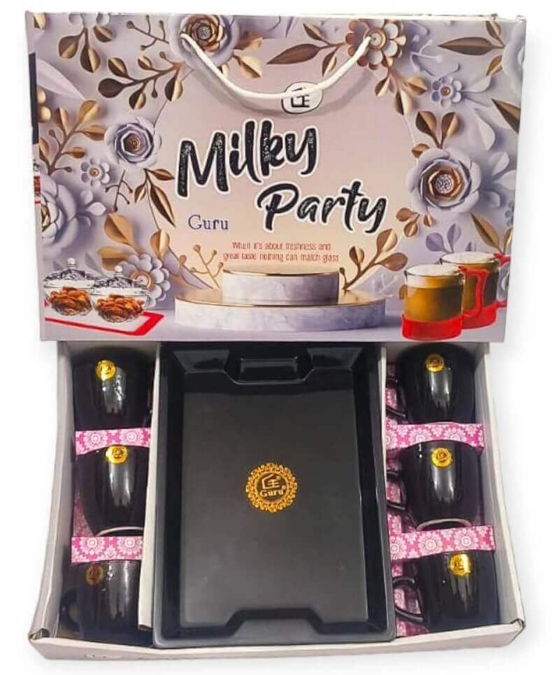 Milky Party (6+1) 1 Serving Tray & 6 Coffee Mugs Gift Set for Gift use Festival/Corporate/Wedding/Housewarming/Birthday/Function/Return Gift and for all Occasions. Milky Party (6+1) 1 Serving Tray & 6 Coffee Mugs 7 Pcs Set with 1 Black Color Long Serving Tray and 6 Black Color Coffee Mugs Exclusive Ceramic set for Kitchen & Dining Purpose.